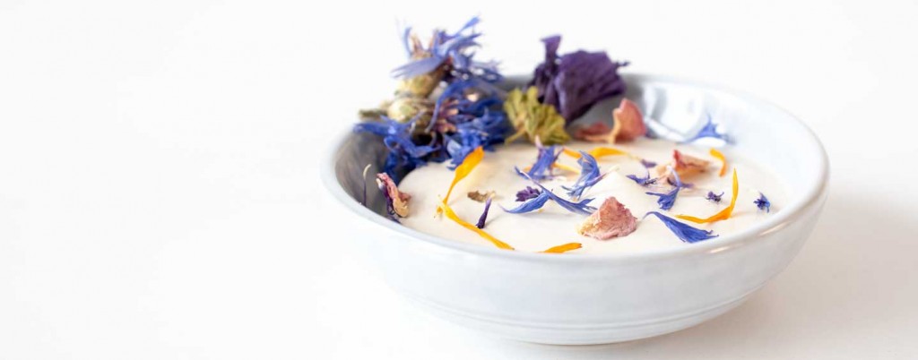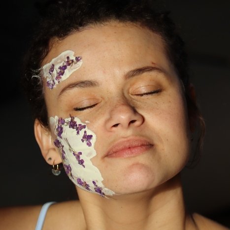 Mon masque à l’argile blanche et aux pétales de fleurs.